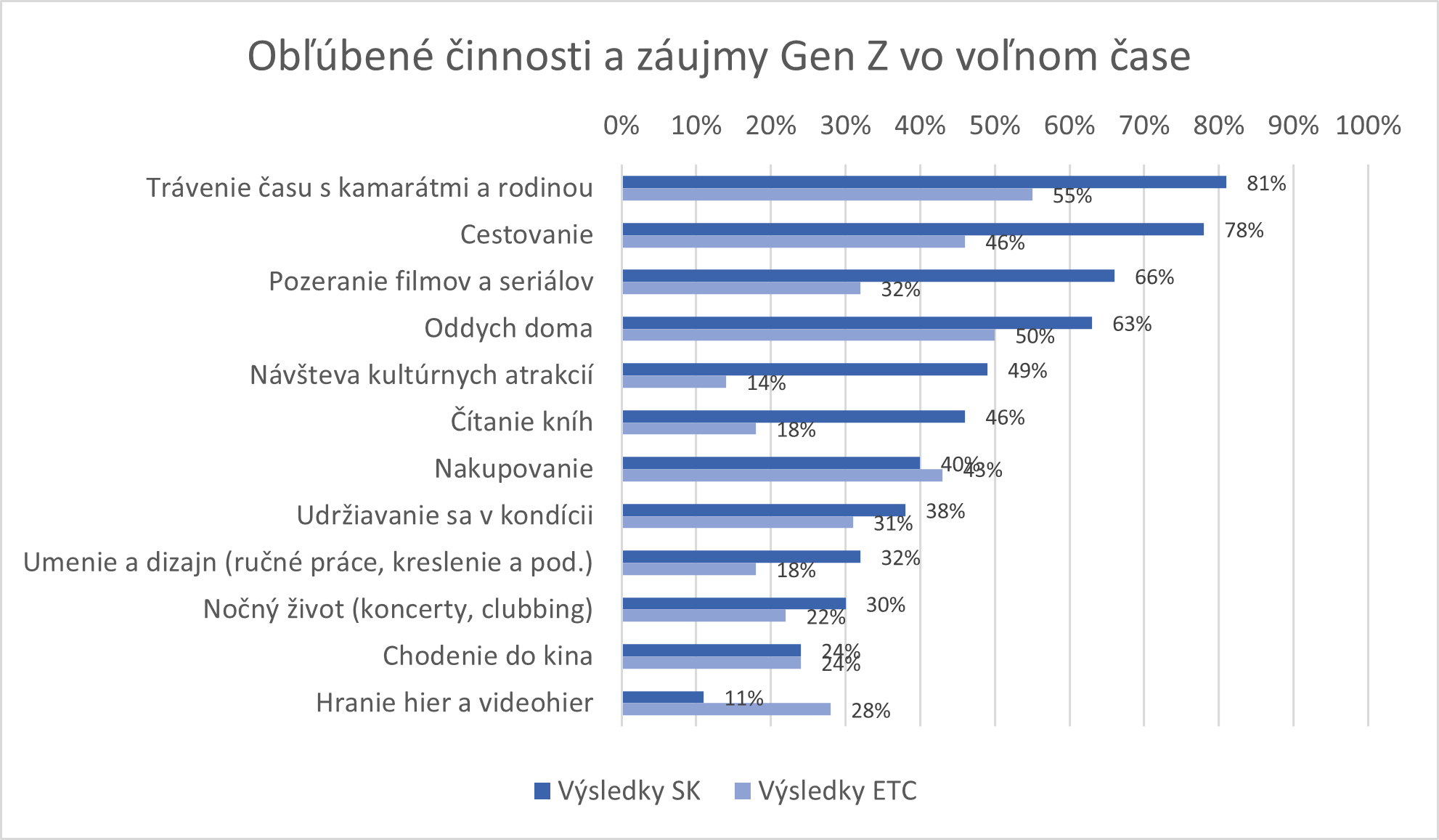 Vstupná otázka bola všeobecne zameraná na obľúbené činnosti a záujmy generácie Z. V našich podmienkach ide o približné kopírovanie európskeho trendu. Medzi najobľúbenejšie činnosti patrí trávenie času s priateľmi (SK 81 % – ETC 55 %), cestovanie (ETC 46 % – SK 78%), pozeranie seriálov a oddych doma (SK – 66 %). Až 78 % slovenských respondentov deklaruje cestovanie ako obľúbenú aktivitu voči 46 % priemeru zo správy ETC. Veľmi zhodné percentuálne hodnoty sa prejavili napr. v oblastiach nakupovanie, starostlivosť o fyzickú kondíciu, návšteva kina. O niečo vyššie voči európskemu priemeru sa umiestnilo napr. čítanie kníh, nižšie pozície sú prítomné napr. pri hraní videohier (ETC 28 % – SK 11 %).