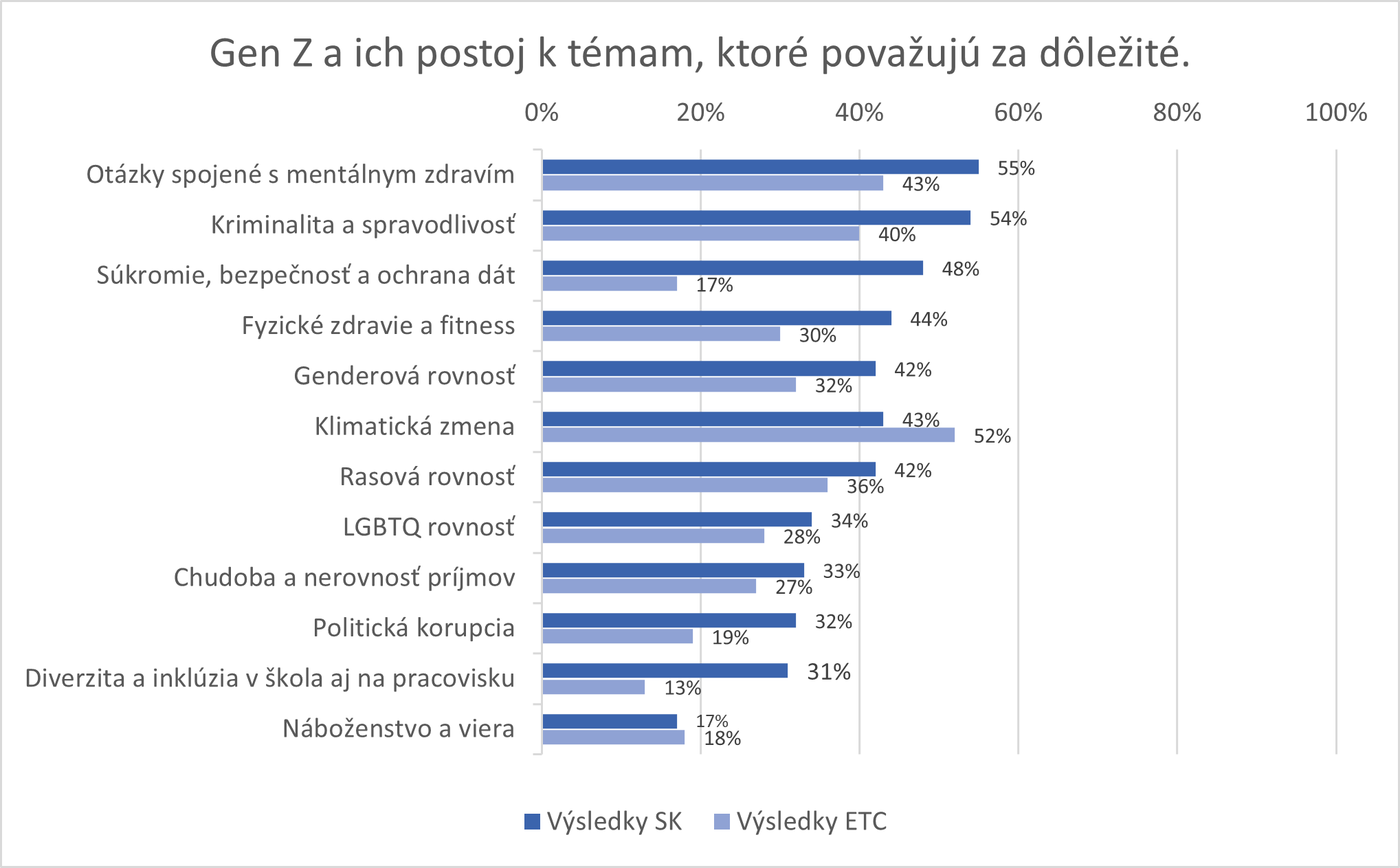 Otázka č. 6 sledovala, ktoré témy sú pre mladú generáciu dôležité. Výsledky opäť kopírujú globálny trend s miernymi odchýlkami. U slovenských študentov a študentiek je najdôležitejšou témou mentálne zdravie (SK 55 %, ETC 42 %), nasleduje kriminalita a spravodlivosť (SK 54 % – ETC 40 %), súkromie a ochrana dát (SK – 48 %), fyzické zdravie (SK – 44 %). Klimatická zmena sa objavuje až na 6. pozícii (43 %) v porovnaní s výsledkami ETC, kde z prieskumu vyšla ako najdôležitejšia problematika (52 %), i keď v percentuálnom vyčíslení to nie sú až tak výrazné rozdiely. Zhodne u oboch segmentov možno sledovať napr. oslabenie pozície viery a náboženstva (SK – 17 %, ETC – 18 %). Ostatné položky sa prejavujú obdobne.