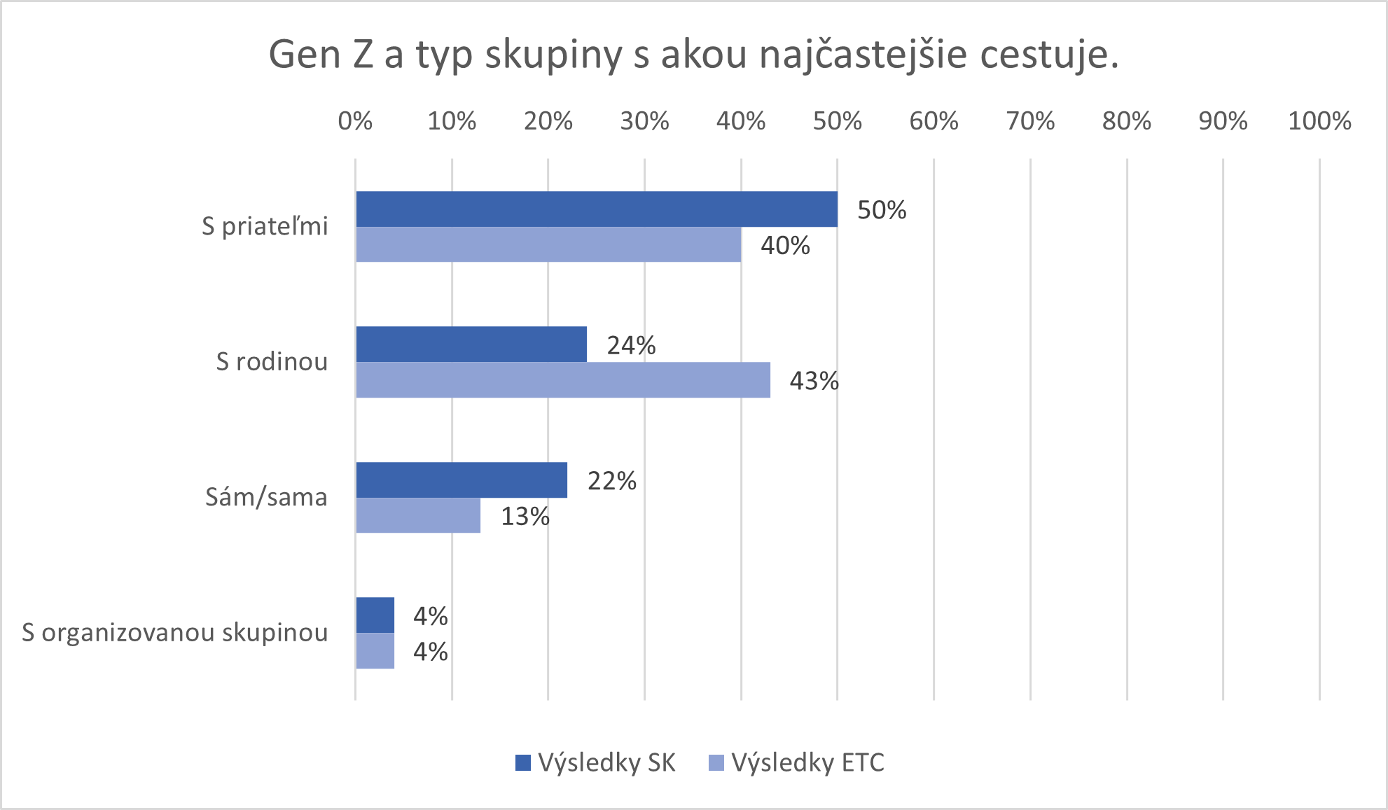 Otázka č. 6 bola zameraná na zistenie, s kým najčastejšie príslušníci Gen Z cestujú. Pri slovenských respondentoch je prítomné mierne navýšenie na strane priateľov na úrovni 50% (ETC – 40 %), nižšie u rodiny (SK 24 % – ETC 43 %), vyššie pri koncepte sólo cestovania (SK 22 % – ETC 13 %) a zhodne najslabšie v kontexte organizovaného pobytu (len 4 % u oboch skupín). V tomto kontexte je potrebné aj poukázať na to, že respondenti vnímajú rozdiel medzi preferovanými partnermi (s ktorými by chceli cestovať) a skutočnými partnermi v cestovaní (s ktorými naozaj cestujú) – tu bola otázka formulovaná v zmysle najčastejšej uskutočnenej realizácie pobytu.