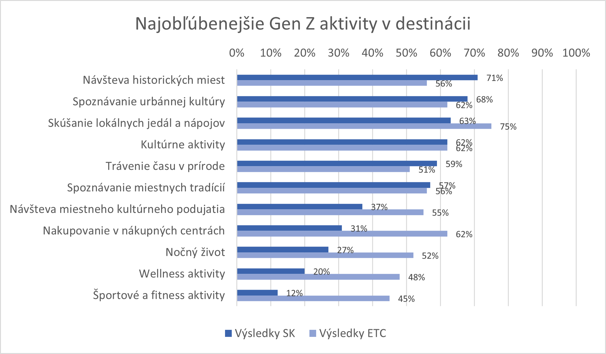 Súhrnne možno konštatovať, že slovenskí študenti sa vo svojich postojoch do istej miery prekrývajú s výslednými zisteniami ETC. Príbuzné sú vykonávané aktivity vo voľnom čase (napr. trávenie voľného času s priateľmi, rodinou a cestovanie)i v destinácii (akcent na kultúru, históriu, gastronómiu a urbánny život s množstvom diverzifikovanej ponuky). Z hľadiska dôležitosti tém najviac u slovenských respondentov rezonuje mentálne zdravie, kým v prieskume ETC to bola klimatická zmena. Oba segmenty cestujú prevažne s priateľmi alebo rodinou, slovenskí respondenti o niečo výraznejšie cestujú aj individuálne. Sociálne médiá sú integrovanou súčasťou ich pobytu, využívajú ich na dennej báze a sú pri slovenských respondentoch zároveň najväčšou inšpiráciou pri ich výbere destinácií. Pomerne prekvapivo neprejavila nami skúmaná vzorka výrazný záujem o neštandardné druhy turizmu ako sú temný turizmus, virtuálna realita či transformatívne cestovanie, skôr inklinovala k bežným zážitkom, autenticite, wellness a oddychu.