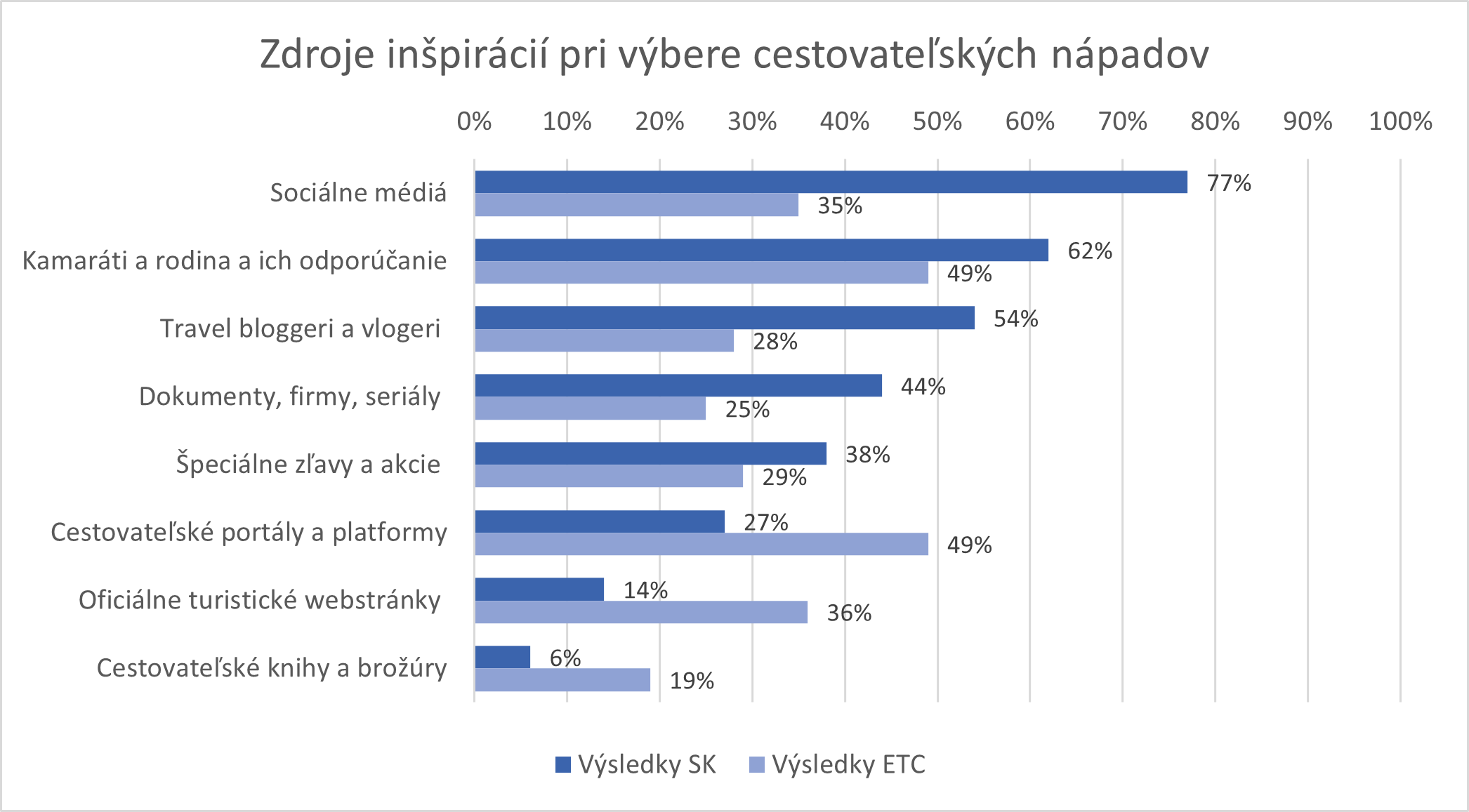 Otázka č. 8 akcentovala, odkiaľ respondenti čerpajú inšpiráciu pri výbere cestovateľských nápadov. Kým vo výsledkoch ETC sú zhodne najdôležitejším zdrojom inšpirácie priatelia a rodina (49 %) a odporúčania cestovateľských portálov (49 %), u 77 % slovenských respondentov sú rozhodujúce sociálne médiá. Vysoko sa umiestnili aj travel bloggeri a vloggeri (54 %) a upozorňujeme aj na vplyv dokumentov, filmov a seriálov (44 %), menší dôraz bol kladený napr. na cestovateľské portály (27 %). Najnižšie hodnoty u slovenských respondentov zaznamenali oficiálne webstránky (SK – 14 %, ETC – 36 %) a cestovateľské knihy a printové materiály (SK 6 %, ETC 19 %).