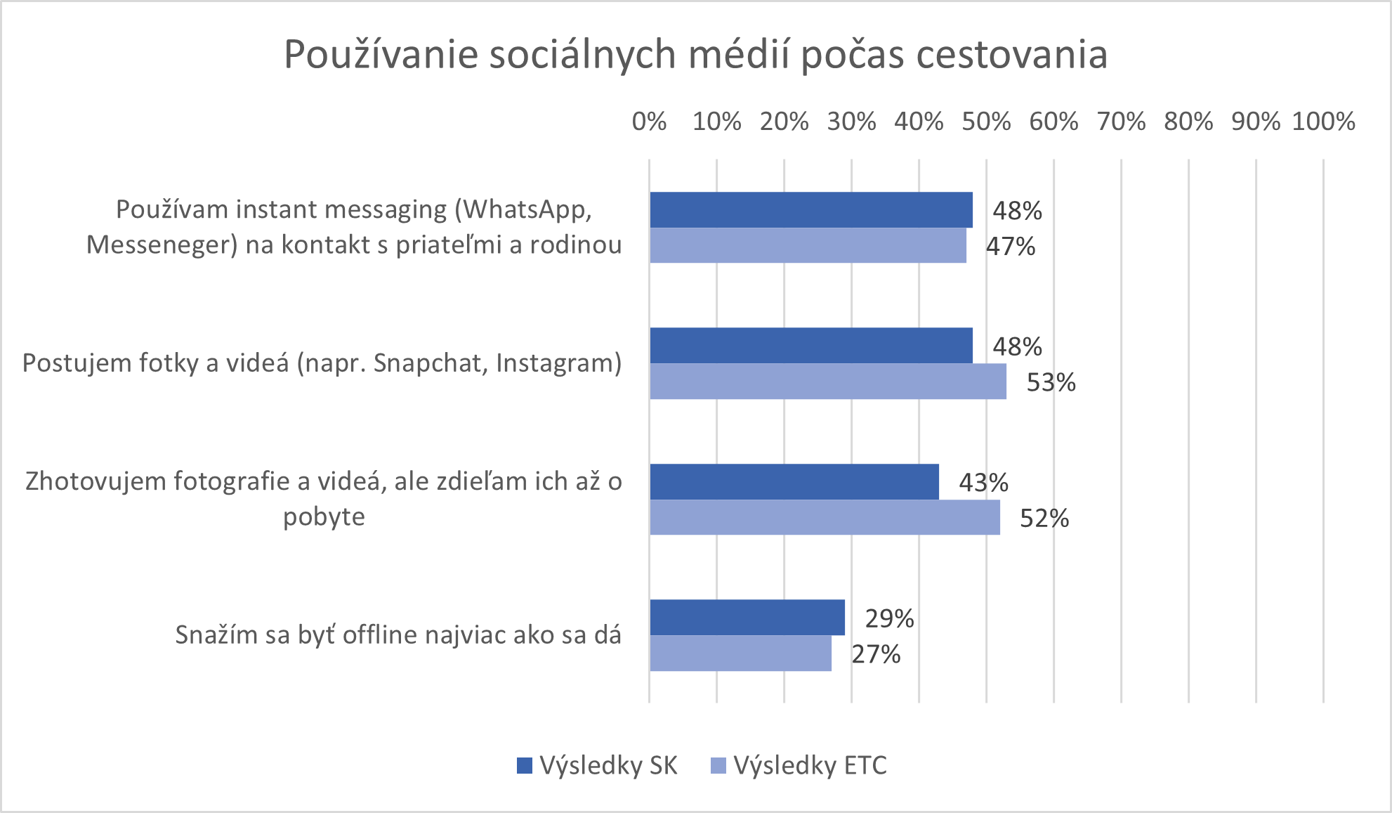 Otázka č. 9 bola zameraná na to, do akej miery počas cestovania využívajú respondenti sociálne média a ktoré formy komunikácie uprednostňujú. Výsledky sú porovnateľné. Približne polovica z respondentov u oboch segmentov používa instant messaging (ETC – 47% a SK – 48 %) a zdieľanie živého obsahu (ETC – 53 % a SK – 48 %) a zhodne takmer 30% sa snaží byť off-line v maximálnej možnej miere. Tu je trend konvergencie veľmi silný a ukazuje sa tu podobné zastúpenie rôznych typov používateľov sociálnych médií.