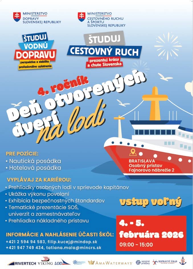 V dňoch 4. – 5. februára 2026 sa zástupcovia ústavu, prof. Michalík, dr. Molnárová, dr. Kompasová a dr. Fúsková, zúčastnili na 4. ročníku podujatia Študuj vodnú dopravu a cestovný ruch – Deň otvorených dverí na lodi v Bratislave. Cieľom podujatia, ktorého zastrešujúcimi organizáciami sú Ministerstvo dopravy SR a Ministerstvo cestovného ruchu a športu SR, je posilniť záujem o štúdium a kariéru v rôznych odborov súvisiacich s vodnou dopravou a cestovným ruchom. V bratislavskom Osobnom prístave bola pripravená prezentácia zamestnávateľov, stredných odborných škôl a vysokých škôl zameriavajúcich sa na oblasti ako vodné hospodárstvo, doprava, služby v cestovnom ruchu či hotelierstvo a gastronómia.