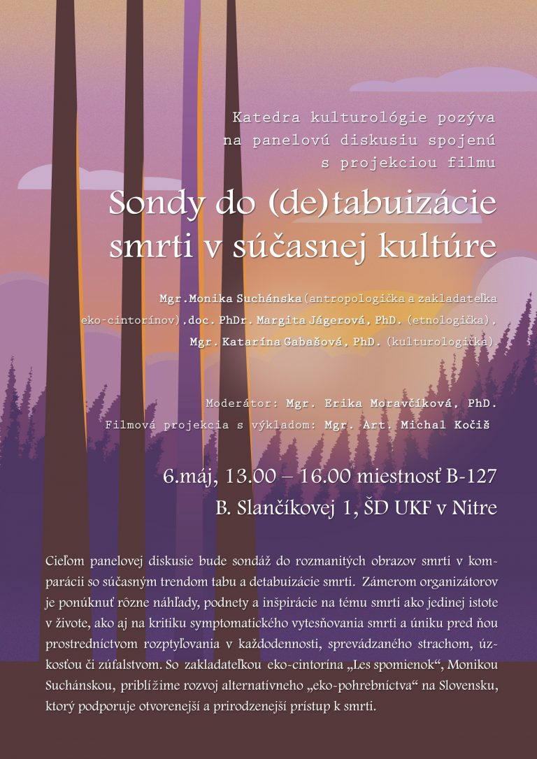 Cieľom panelovej diskusie bude sondáž do rozmanitých obrazov smrti v komparácii so súčasným trendom tabu a detabuizácie smrti. Zámerom organizátorov je ponúknuť rôzne náhľady, podnety a inšpirácie na tému smrti ako jedinej istote v živote, ako aj na kritiku symptomatického vytesňovania smrti a úniku pred ňou prostredníctvom rozptyľovania v každodennosti, sprevádzaného strachom, úzkosťou či zúfalstvom. So zakladateľkou eko-cintorína „Les spomienok“, Monikou Suchánskou, priblížime rozvoj alternatívneho „eko-pohrebníctva“ na Slovensku, ktorý podporuje otvorenejší a prirodzenejší prístup k smrti.